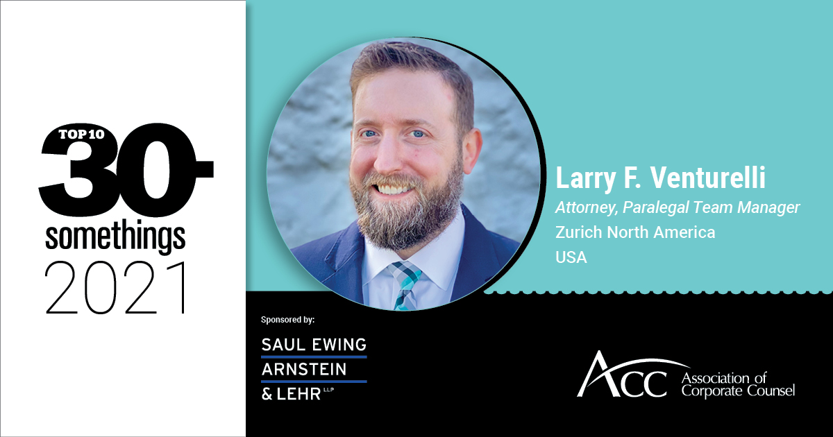 Larry Venturelli joined Zurich North America, a commercial insurance company that provides insurance to more than 95 percent of the Fortune 500, as a paralegal in 2011. He knew he wanted to work in the corporate world rather than a law firm after earning his JD, so he took the paralegal position knowing he would have to prove his worth. Fewer than three years later, he was promoted to an attorney position, managing four paralegals. Today, he is a recognized leader in the legal department, responsible for the insurance giant’s end-to-end subpoena process.