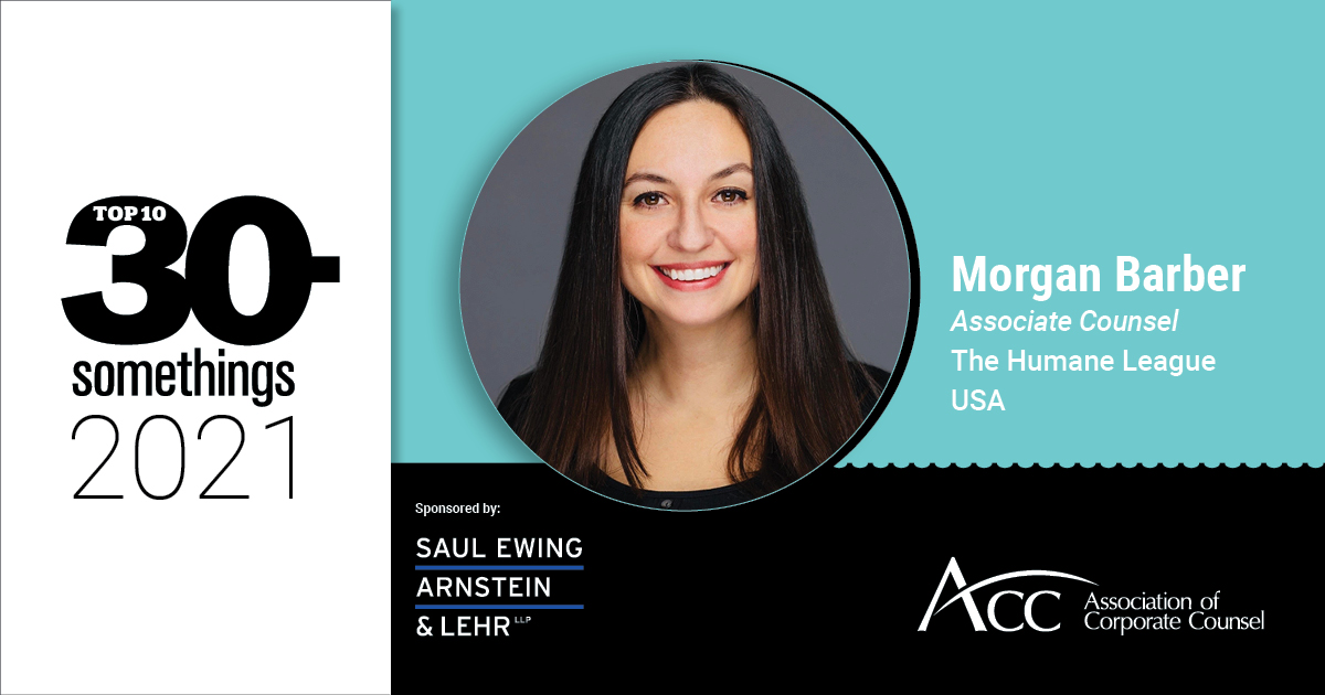 Morgan Barber has had a single professional goal since deciding to study law: advance legal protections for animals as nonprofit in-house counsel. Now associate counsel at The Humane League (THL), Morgan has accomplished that goal.