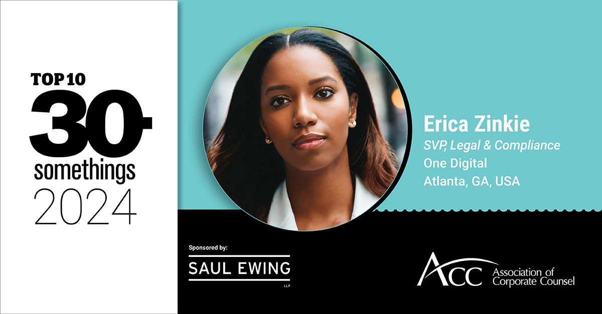 The pressure cooker of Big Law is often thought of as the traditional way to start a legal career. But after graduating into the glum prospects of the 2011 recession, Erica Zinkie decided to try a different route. Her achievements at OneDigital, where she is now senior vice president, legal and compliance, and her climb to senior leadership before she was even eligible for this award (that is, 30 years old), prove that Big Law isn’t the only route to becoming a corporate counsel.