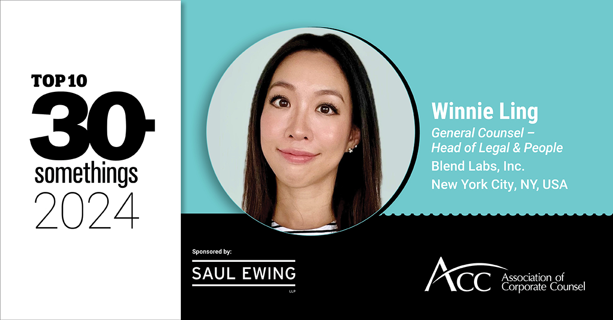 The ACC Top 10 30-Somethings awards recognize in-house counsel between the ages of 30 and 39 for their innovation, approach to challenges, well-rounded perspectives, contributions to the in-house community, and pro bono and volunteer work.