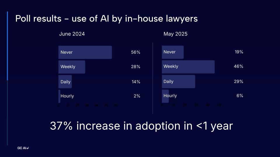 GC AI predicts that this will soon be the new norm: From company-wide meetings where legal highlights their AI wins to legal prompt sprints each quarter, the market is maturing in real time. The poll results below show the full breakdown of the year-over-year shift: