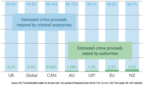 Illicit funds disruption scarcely has the impact of a rounding error in the accounts of “Criminals, Inc.” This suggests that modern AML rules are almost completely ineffective in disrupting the proceeds and funding of serious crime.