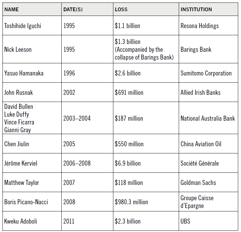 This, of course, is not the first time banks have paid a heavy price for rogue traders. In 2012, the trader known as the London Whale lost at least $6.2 billion for JPMorgan Chase & Co. That same year, it was discovered that traders at major banks — particularly Barclays, UBS, Rabobank and the Royal Bank of Scotland — had been manipulating the London Interbank Offer Rate for their own benefit since at least 1991, resulting in $6 billion in fines. And these are just the latest in a long history of banks paying a heavy price for poor regulation of their traders. On the next page you’ll find a short list of some of the most notorious rogue traders and the punishing losses associated with their exploits.