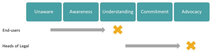 Your end-users usually start out unaware. You want to bring them to a place of understanding, while your heads of legal, presumably those sponsoring and involved in the decision-making on the project, begin at a place of understanding. You want to bring these individuals to a place of advocacy — getting them to spread the good news throughout the organization.