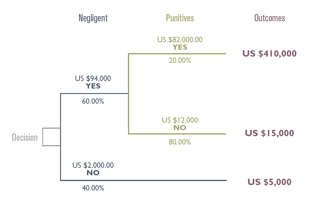 Now let’s look at the potential outcomes in the right-hand column. Starting at the second number from the bottom, if your company is not found negligent, all it would be liable for are court costs and attorney’s fees, which we are estimating will be on the order of US$5,000. Going to the next number up, if the court finds your client negligent but does not feel punitive damages should be imposed, we estimate that there will be damages of US$10,000 plus the same US$5,000 in court costs and attorney’s fees, for a total of US$15,000. Finally, the top number is the estimated outcome if the court does impose punitive damages, consisting of US$400,000 in total damages and US$10,000 in court costs and attorney’s fees (higher because once punitive damages are allowed you tend to spend more in attorney’s fees). Good so far?