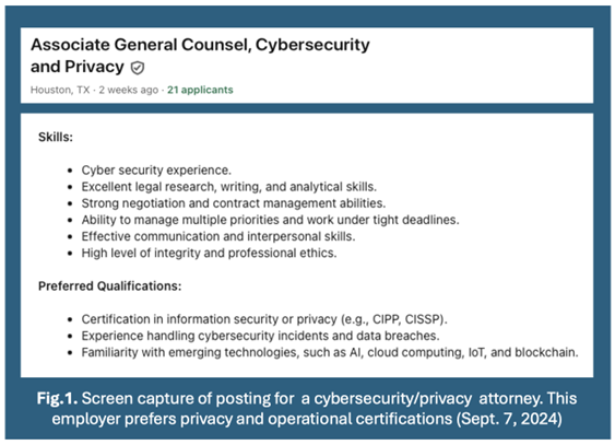 Why include a privacy certification in a guide for cybersecurity counsel? First, because the overlap between privacy and cybersecurity often requires joint work. For example, many companies are also hiring lawyers to fulfill a joint cyber/privacy role (see fig. 1). If privacy attorneys are reading my article, I encourage you to pursue a cybersecurity certification for the same reason.