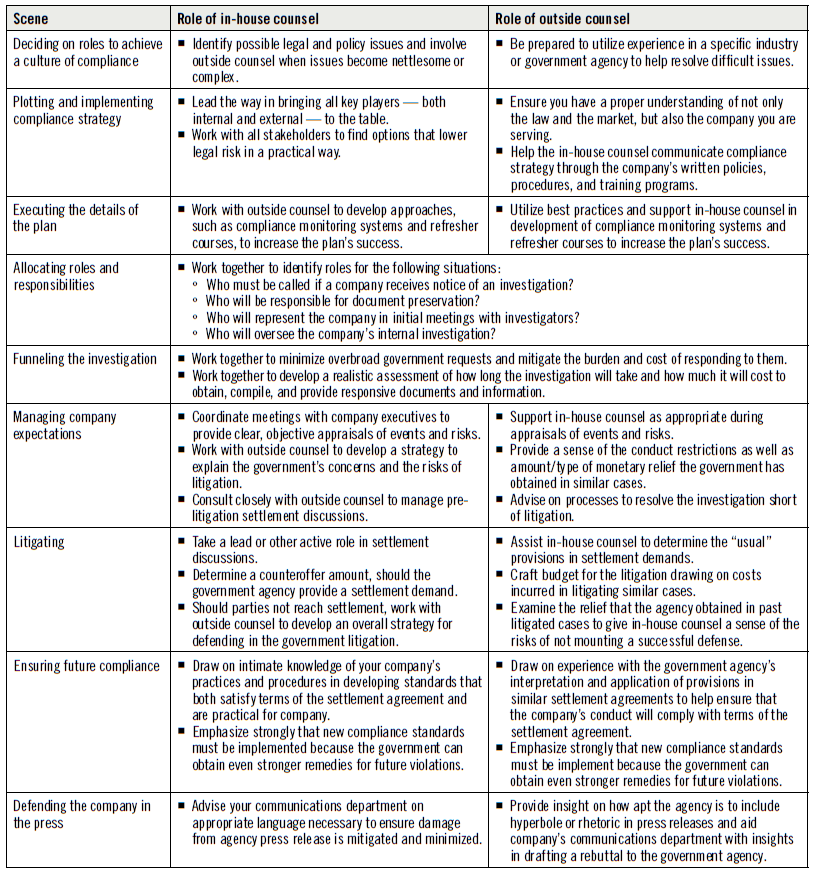 If such a policy is not in place prior to the commencement of a government investigation, it is critical that in-house and outside counsel have a candid and comprehensive discussion about these roles as soon as an investigation starts. Well-placed epithets directed at the government agency at this point are typical and cathartic, and they encourage counsel to become closer allies in opposing a common adversary.