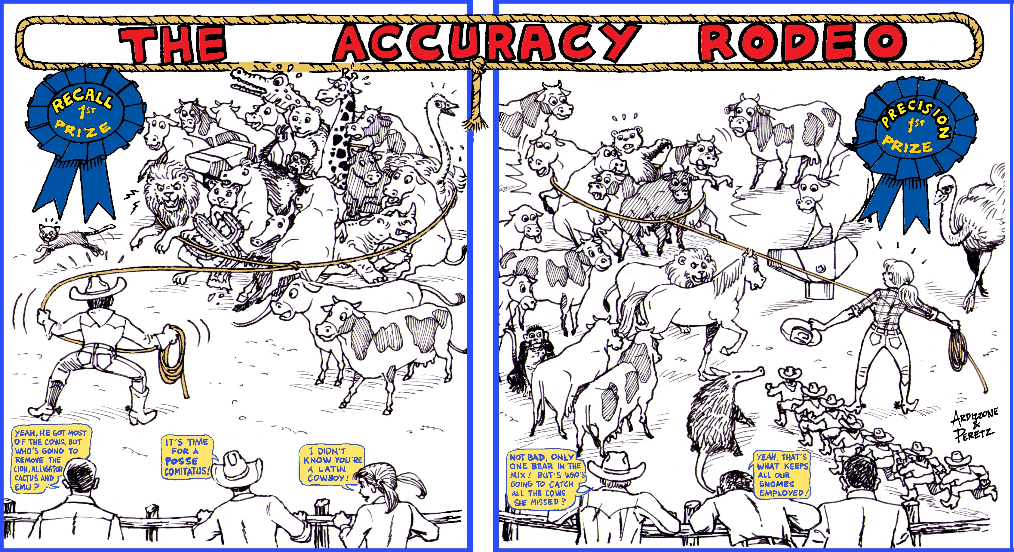 The result is that a model with high recall, but poor precision, which could have lots of false alarms that require a human to investigate. A high recall model is like a person who subscribes to every newspaper and magazine in the country, so she doesn’t miss an important story, with the result being that she has endless chaff to sort out in order to find the wheat.