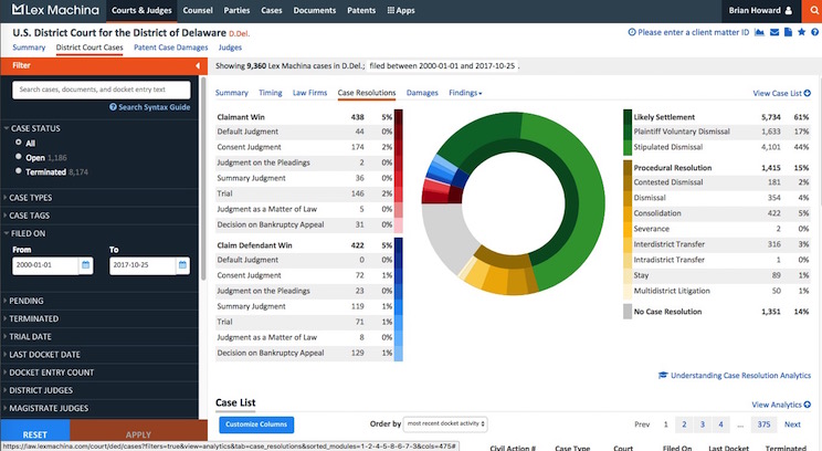 Legal analytics offer tremendous insights to uncover trends that bolster litigation strategy as well. For in-house counsel, tools like Lex Machina™ can help companies select the best law firm to handle a matter by comparing case timing statistics, such as success in winning previous cases, damages won or lost, and injunctive relief. Outside counsel can similarly demonstrate their success quantitatively, for example showing a potential client how they surpass the client's current counsel in key metrics. Litigators can learn about a judge's behavior (e.g., prior experience with similar cases, timing and amenability of motions practice, and damages history), or even the behavior of a district as a whole, which can be invaluable for evaluating whether to seek transfer. Lex Machina and other similar services allow lawyers to explore the litigation history of the opposing counsel or parties along similar metrics. For example, one might react differently to a firm that has filed more than 50 cases, all of which have settled within months, than one might to a firm that has taken multiple cases to trial and won. Understanding the data behind the litigation landscape improves the ability of companies to select and budget counsel, and of firms to win cases.