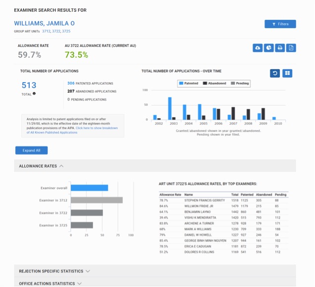The global software company Oracle is using patent analytics to achieve competitive advantages in patent portfolio development and prosecution. The Oracle team looks carefully at the USPTO examiner’s statistics as well as law firm statistics to help determine where resources can be most efficiently devoted to securing reasonably broad patent protection, both before applications have been filed and as strategies change for applications during prosecution.