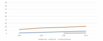 • Lingering inequalities. In law firms, minorities represent 7.5 percent of partners and minority women constitute only 2.5 percent of partners.