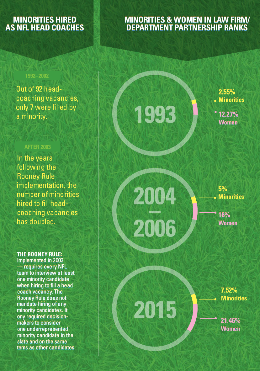 The NFL’s progress in fostering diversity at the highest levels of the coaching profession suggests that the legal industry can do better by implementing the Rooney Rule to give underrepresented minorities opportunities to succeed.