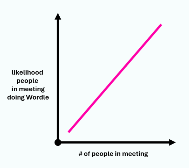 Meetings are worse. While you can swiftly archive bothersome emails once you see you’re superfluous, it’s harder to tune out when you’re in a meeting. Or more precisely, it’s harder to tune out in order to do something more productive instead. Meetings do offer prime opportunities for other pastimes: NY Times, LinkedIn, and of course Wordle.