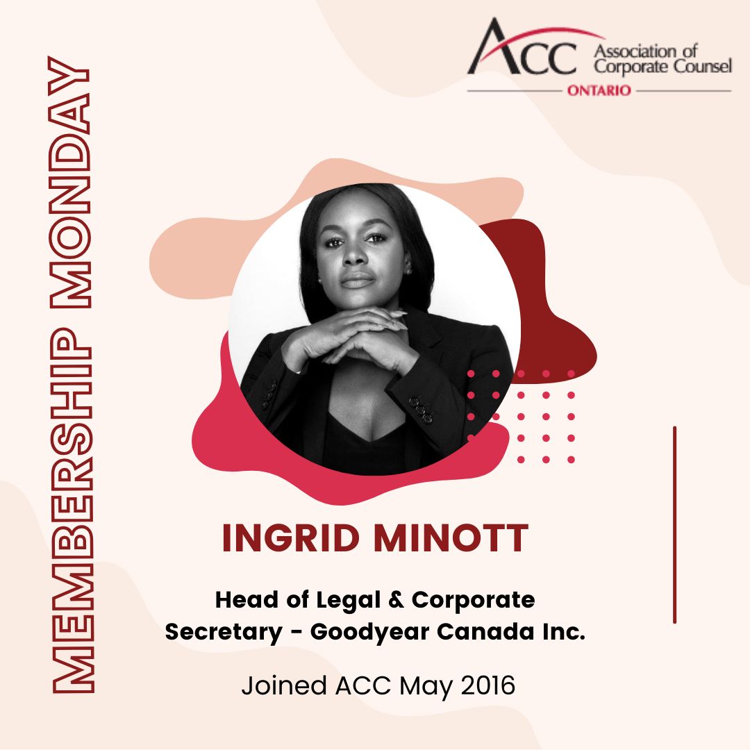 Introducing Ingrid Minott, head of legal and company secretary at Goodyear Canada Inc., the Canadian subsidiary of The Goodyear Tire & Rubber Company, one of the most recognized and respected mobility brands in the world 🚗. Minott has been a member of the ACC with both the Ontario and Ohio chapters having first joined in 2016. Minott has enjoyed the unique professional development programs, access to legal resources, and the opportunity to connect with other in house counsel.