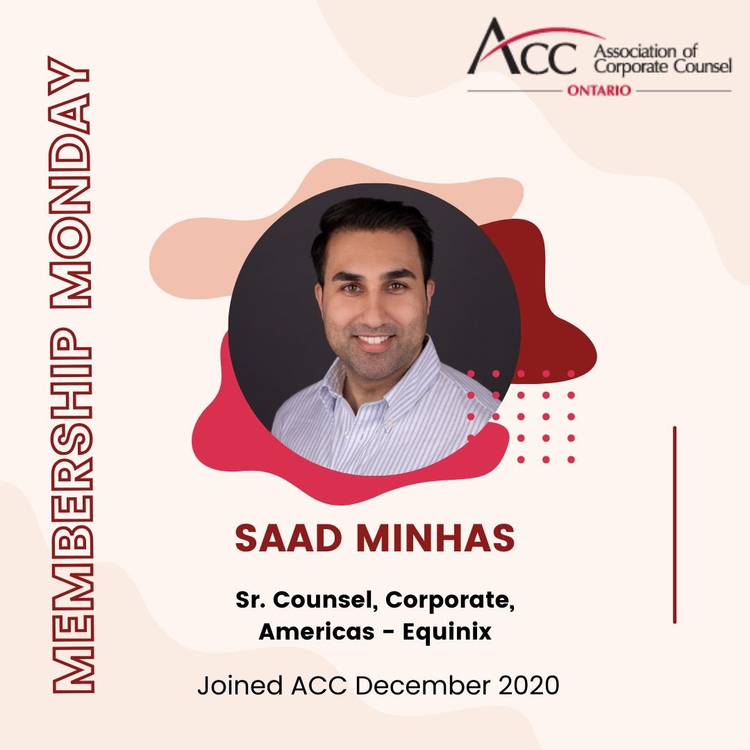 Introducing Saad Minhas, senior counsel, corporate, Americas for Equinix, a global leader in data centers! Minhas joined ACC Ontario in December 2020 to connect with other in house counsel, grow professionally, and to find opportunities to mentor or otherwise give back to the bar. ⚖