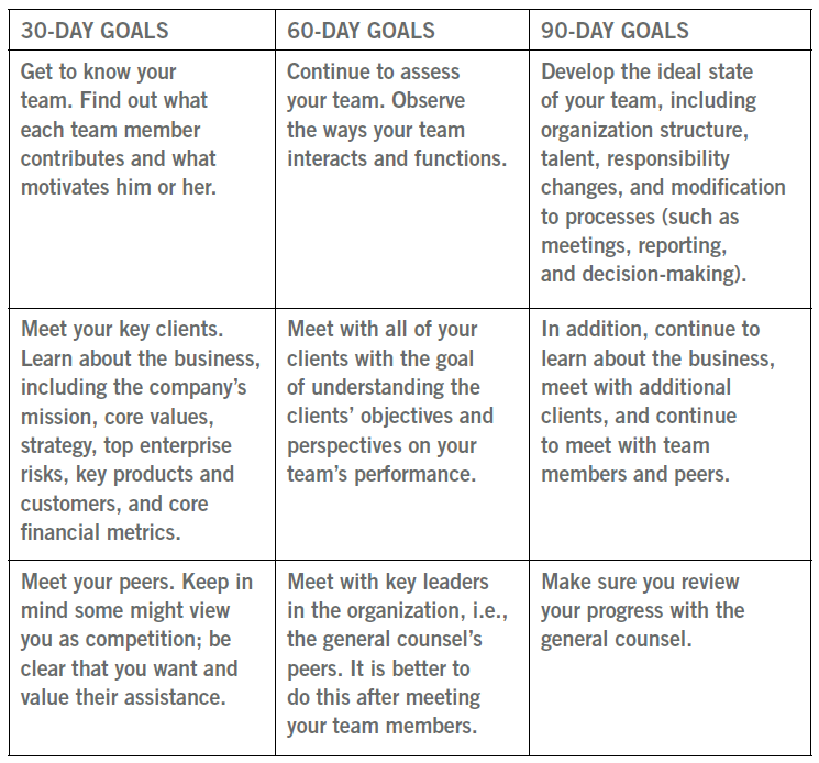 There are unique challenges to hiring a seasoned attorney from a law firm to an in-house management position. Your manager, which is assumed to be the general counsel, can play an instrumental role in your success. It is important for the general counsel to design a plan to provide you the best opportunity to successfully transition to the company. A plan that establishes target completion dates, such as 30 days, 60 days, and 90 days, provides two benefits. First, it allows the general counsel to prioritize the important initial steps in your transition and establish target dates. Second, the plan may serve as a development plan and basis for one-on-one discussions. Third, and probably most important, it allows you to formally reach alignment on the expectations of the general counsel. Lastly, with such a plan in place, you are less likely to feel overwhelmed with a clear road map on how to be successful at the company with target dates for completion.