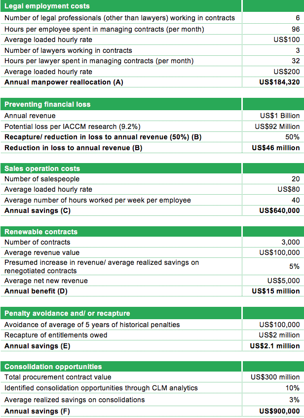 The tool identifies the reduction of expenses and addition of benefits in six areas, drawing from reports at organizations like Goldman Sachs and the International Association for Contract and Commerical Management (IACCM). This information is coupled with the expertise and experience from Ultria’s analysts to project the net benefit of using CLM software in these categories: