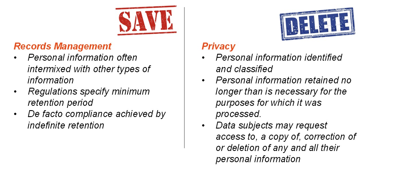 On the surface, records management and privacy requirements can have conflicting interests with each other. Most records management requirements specify a minimum retention period. Airing on a false sense of caution, companies can and often do save their records for longer than the minimum, even indefinitely due to a lack of other requirements. In practice, employees retain both records and non-record electronic information without clear distinctions or retention controls. Over the years this information accumulates and multiplies across the enterprise. Companies rationalize that a “save everything forever” approach is compliant because records are kept for at least the minimum legal requirement, which often serves as the only clear guidance on appropriate retention periods.
