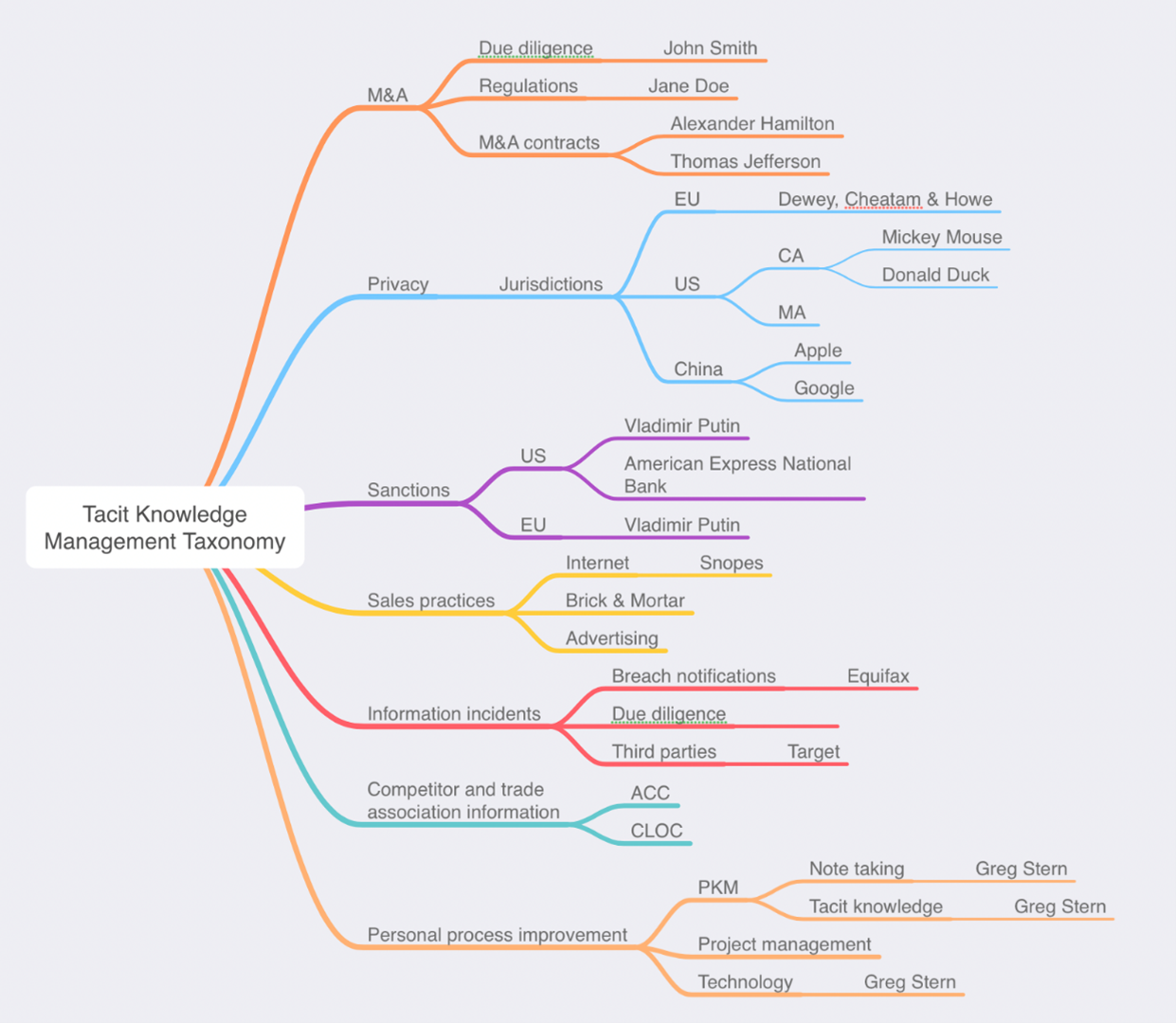 Here is a simple mind map I created to illustrate the idea. Note that the mind map not only includes a taxonomy of personal and tacit knowledge management areas that a lawyer might find useful in doing their job, but on many of the branches, I have indicated people, companies, or law firms that have expertise in those areas.