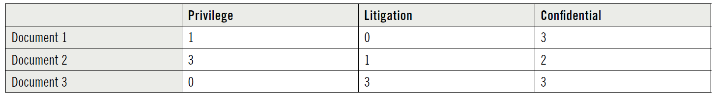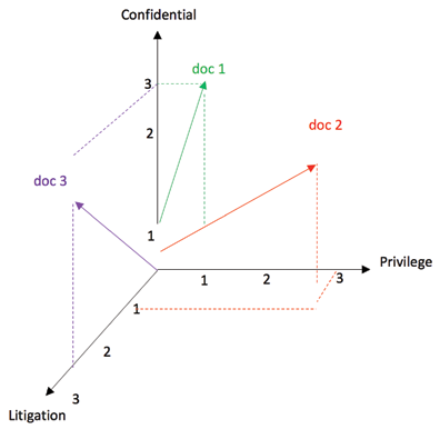 One of the most common models used is called the vector space model. In the vector space model, each document is passed through a filter program in order to extract the base words of interest. For example, the filter program would remove “the,” “and,” “a,” and other unimportant words. Each base word is then represented by an axis in the vector space for that document. The number of times the base word occurs in the document is the length of the vector along that axis. For example, assume that we have three documents that only contain three possible base words after being passed through the filter program: “privilege,” “litigation,” and “confidential.” For each document, the number of times each of these words occur is counted and represented by a document-term matrix as seen below:
