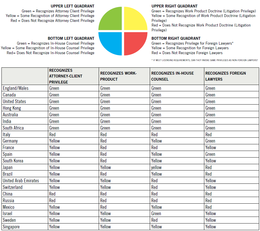 As shown by the above chart, recognition of the full range of US privileges are found nowhere else, with the closest being the common law jurisdictions in the former British Commonwealth nations of Canada, Australia, India and, to some extent, Hong Kong. Each of these common law jurisdictions take somewhat different approaches, summarized in the chart below, you should seek local counsel for more detail. For example, Canadian courts recognize legal advice and litigation privileges much as the England courts, although the contours of the privileges are slightly different, and the general trend for Canadian courts is to construe privilege narrowly.