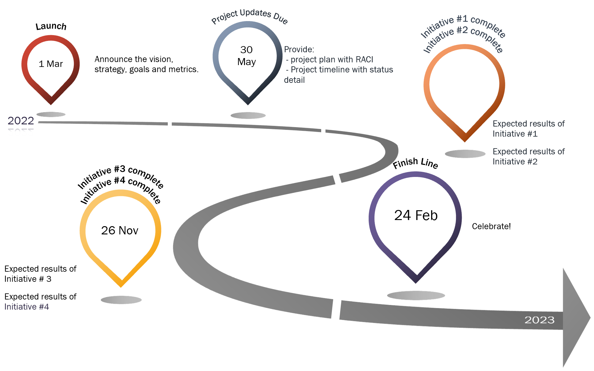 The change management aspect of leading a transformation is vital, and metrics are useful to show progress and sustain momentum. Present the transformation as a journey to help all members of the organization perceive it as manageable. Show how the component initiatives are logically sequenced by designing a roadmap with concrete milestones, which can comprise events such as project completions and results achieved.