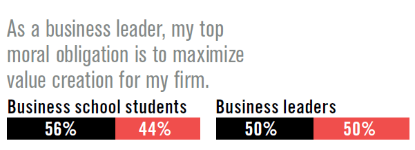 Over one half of those surveyed stated that their “top moral obligation” is to “maximize value creation” for their firm. Those who truly believe that value creation trumps all other moral obligations may rationalize their use of unethical business practices to achieve financial targets. This mindset may be, and likely is, a root cause of many corporate scandals in which “good people” make bad decisions.
