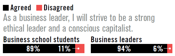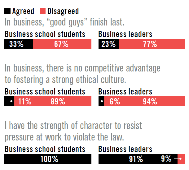 Recently, as a lead-in to a lecture entitled “Building and Sustaining a Strong Ethical Culture,” I used audience response devices to conduct an unscientific survey of business school students and business leaders to seek such an understanding. The results of these two surveys showed:
