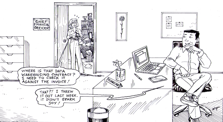 So what would Kondo say about our overflowing stacks of contracts? First and foremost, storage is not an answer. It is a “booby trap,” she writes. This is because “[p]utting things away creates the illusion that the clutter problem has been solved,” but “sooner or later, all the storage units are full, the room once again overflows with things [...] creating a negative spiral.”