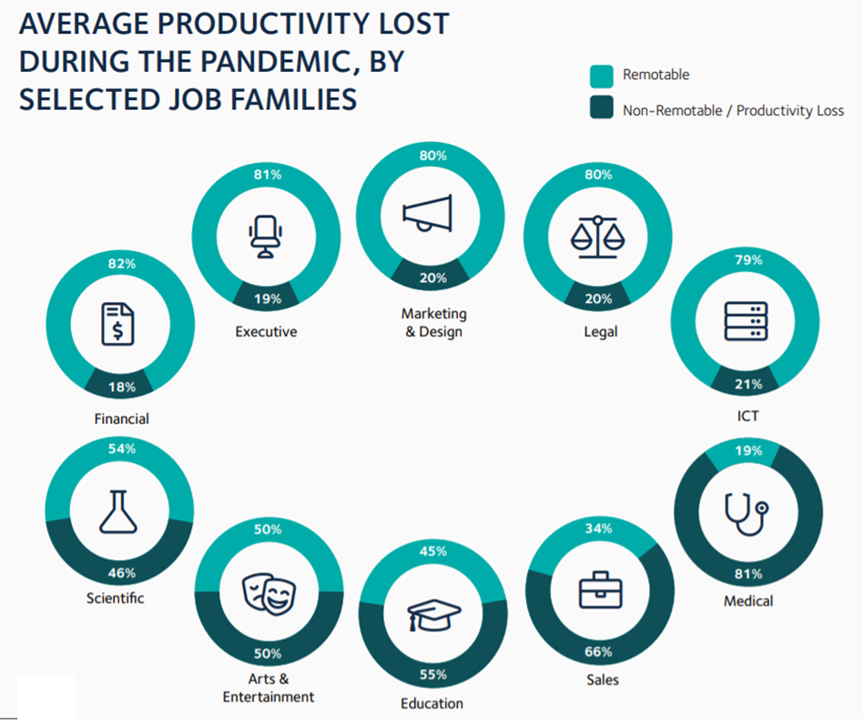 Organizations and governments have already begun the process. For example, a large Australian financial services company has been using big data and AI to begin mapping their teams and organization’s jobs into tasks to understand the impact of remotability on different job families. Restructuring and planning activities are based on predictive models that enable the organization to understand which roles require redesigning to improve productivity. Redesigning the role may involve augmenting the role with digital tools or identifying tasks that must be done onsite. Tasks that require individuals to be on site can be scheduled and rostered appropriately to enable social distancing. Lastly, the organization is using the output from the remotability modelling as an input to their talent strategy as they plan to offer reskilling and upskilling to workers aligned to building the necessary skills and capabilities for identified ‘future-ready roles’. To further illustrate the impact of quantifying remotability by job family, see Figure 1. Produced by Faethm, an AI and augmented analytics platform, the analysis indicates the level of remotability by job family based on the billions of workforce data that the Faethm AI engine is trained on. Korn Ferry has been exploring opportunities with Faethm to help organizations chart their course back to growth with greater precision and predictability using big data, AI, and success profiles. For example, Figure 1 indicates that 80 percent of the activities that are delivered by roles in the legal job family could be performed remotely while 20 percent of the activities are non-remotable. This suggests that when periods of remote work may be necessary to support social distancing and restrictions of movement during the pandemic period, there is a potential 20 percent hit to productivity due to the nature of the activities that cannot be delivered remotely. The implication of this data does not mean the solution is to make all activities in the legal job family 100 percent remotable. Rather, the insight regarding the remotability of legal roles enables broader questions about how the 20 percent of non-remotable work gets done today and what could be reimagined to further augment workers with digital tools.