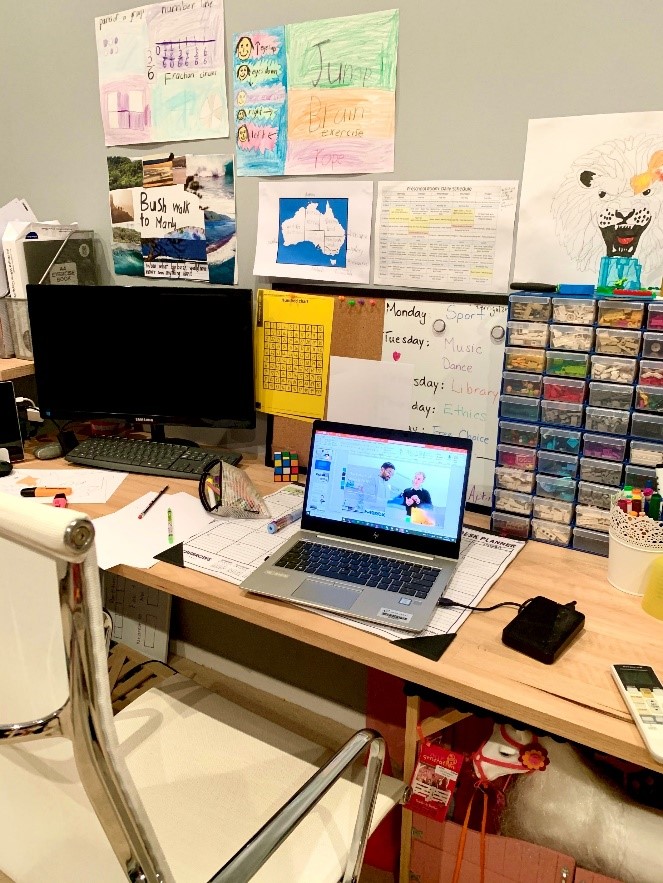 During the shutdown, this is where I worked every day of the week. I shared the space with my daughter who is in primary school (that is her geography assignment hanging proudly above my laptop). My husband, who works for a major bank, also worked from home during this period. We rotated through this space as we supported our daughter through her first experience at online learning while balancing full-time jobs.
