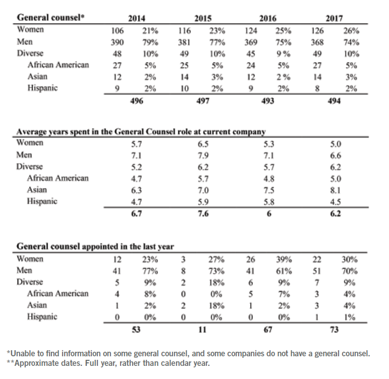 - Recognizing the gap. In 2017, women make up for 25 percent of the Fortune 500 general counsel, and 26.8 percent of S&P general counsel. However, minorities make up just 10 percent of general counsel in Fortune 500 companies and 11.62 percent in S&P companies.